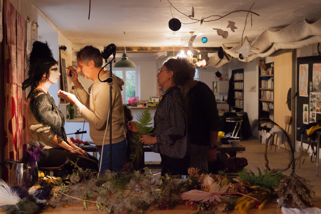 Lors de l’atelier, les participant·e·s ont créé avec les artistes des parures végétales, se métamorphosant au fil des couleurs, des formes et des matières pour célébrer un peuple imaginaire fait d’hommes‑fleurs et de femmes‑oiseaux, de lutins de brousse, de rois et de reines des forêts et des prés…